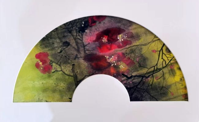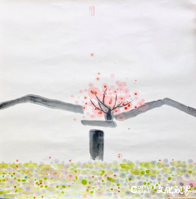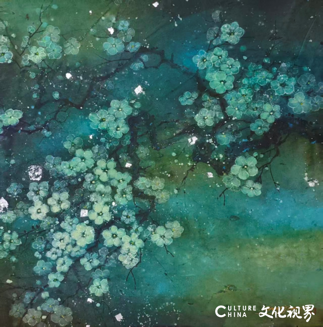 “在艺术创作中,我注重传统媒介符号的现代性转化,水彩作品《梅花引》即是对这一理念的实践:通过水彩颜料的特性,试图在具象与意象之间建构对话,静谧与动态之间形成平衡,呼应了古曲中‘梅花’所象征的精神内核,将现代形式与传统意蕴相融合,用重复与变奏来表现梅花的神韵,形成水、色、光交融的视觉‘变奏’。”