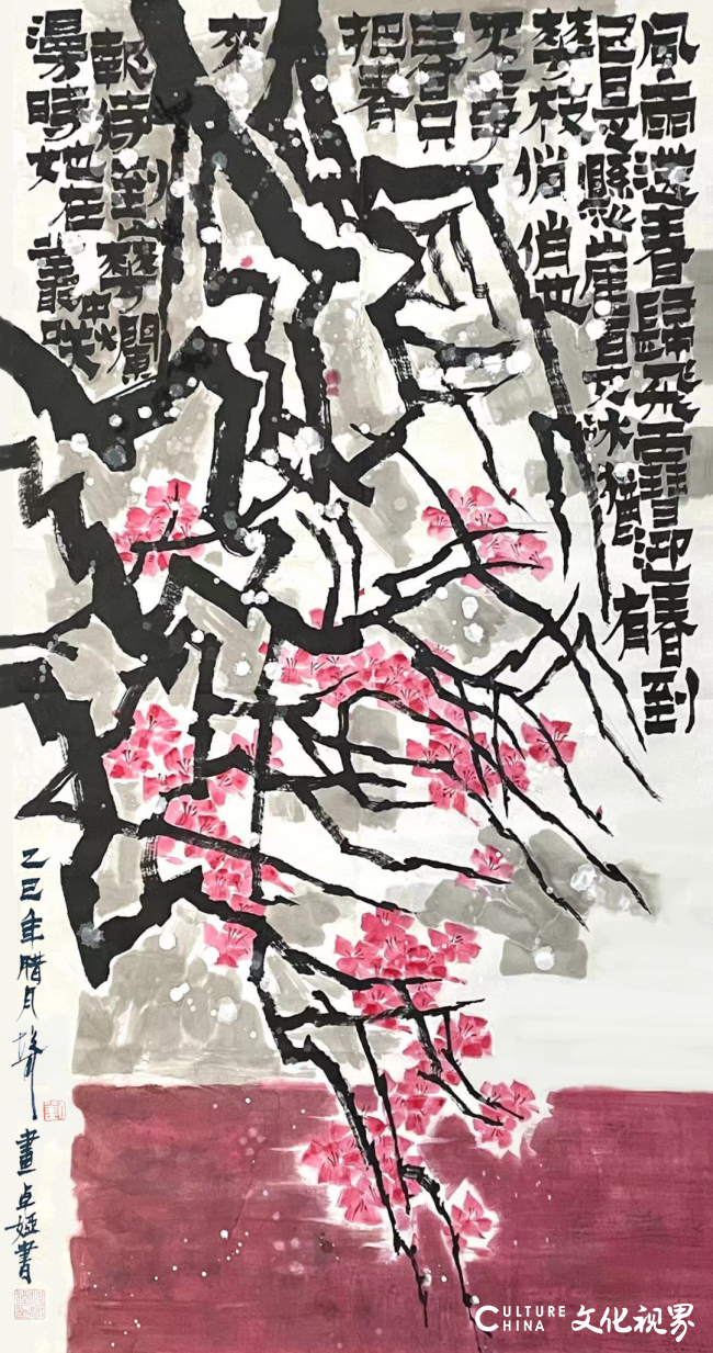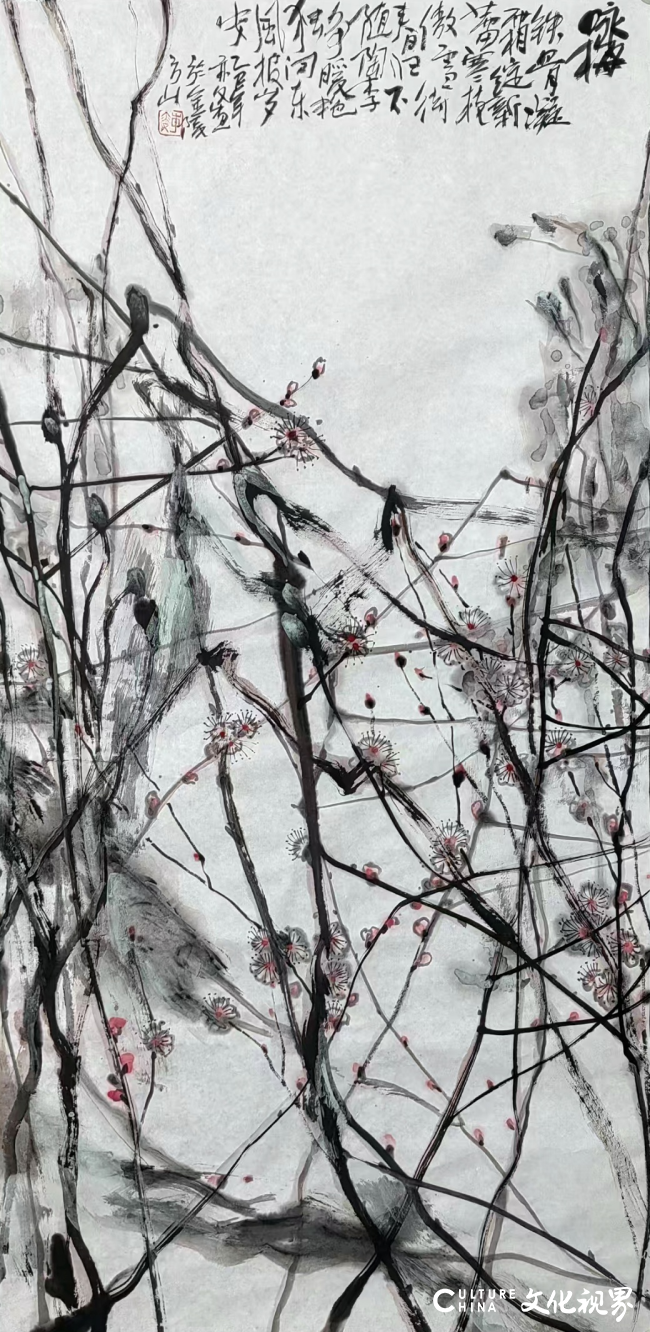 作品名称:《寒梅傲雪报春来,瘦影凌霜破蕊开》纸本水墨尺寸:69x138cm创作年代:2026年