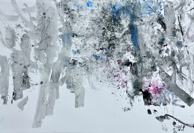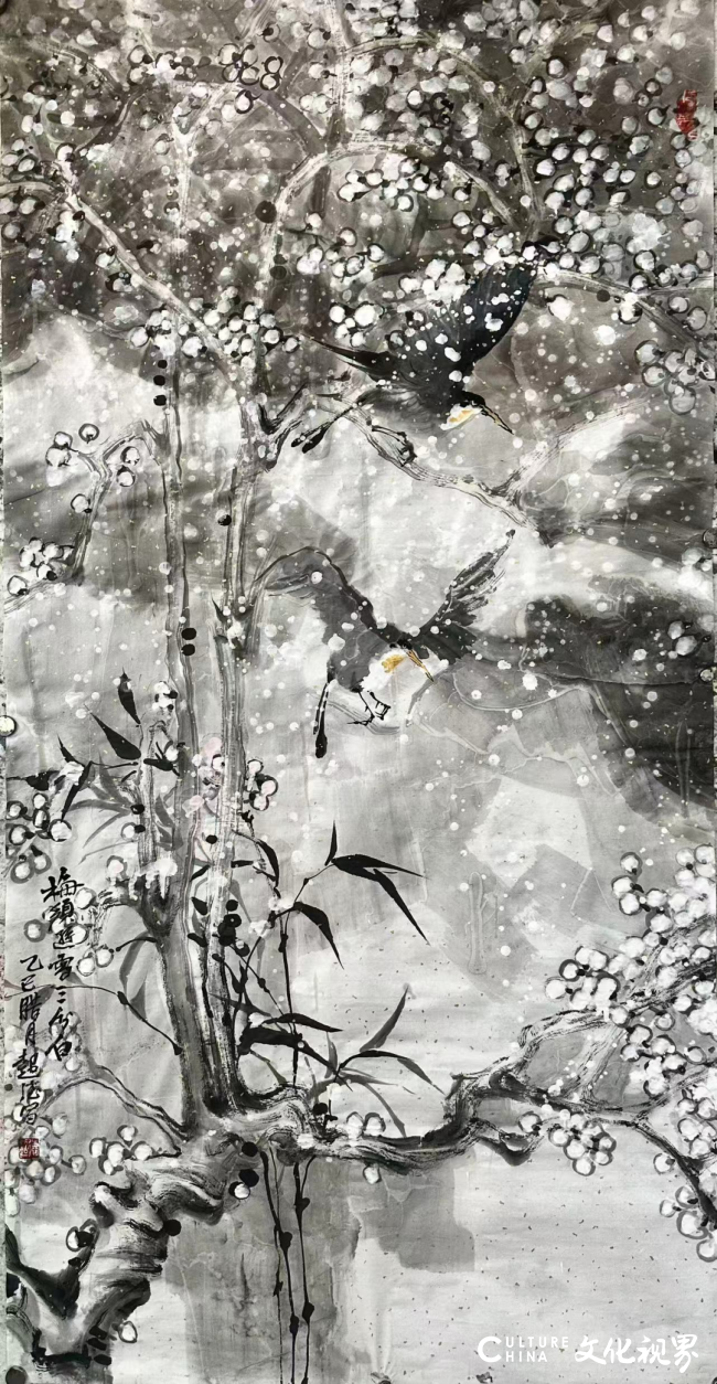 “专业教书、做研究,业余画画。我越来越觉得艺术的最佳状态是业余的状态对我而言是如此重要,画画无须那么沉重,开心就好!当以水墨的纯粹性,探讨逆境中生命与自然的辩证关系。风雪非为衬托高洁而存在,梅鸟亦非征服严寒的英雄——三者共同构成一种永恒的角逐与共舞,在墨色的浓淡里抵达精神的均衡。在黑白天地间,诠释着‘不争之争’的东方智慧。”