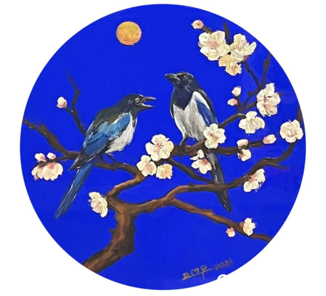 作品名称:《喜上“梅”梢》油画尺寸:30X30cm创作年代:2026年