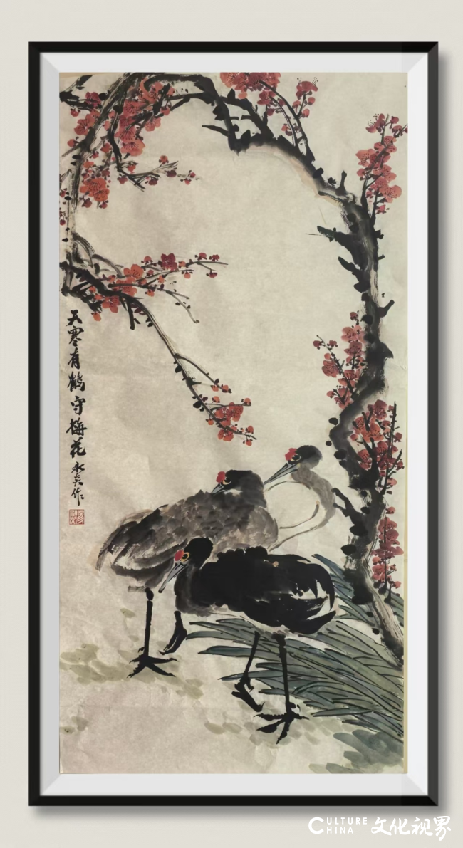 作品名称:《天寒有鹤守梅花》中国画尺寸:68x138cm创作年代:2026年
