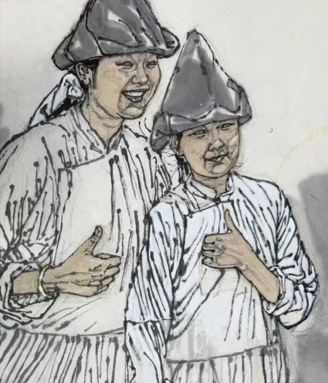 画面里的姐妹俩,是笔墨与生活的相遇。她们头上的帽子,形状似倒扣的小锥,是布里亚特人特有的标识,墨色的浓淡在帽檐处轻轻转了个弯,便有了皮质的柔软与光泽。身上的长衣以细密的墨线勾勒,线条像草原上的风,时而迅疾,时而舒缓,织就出布料的纹理,那该是经了日光晒、草原风吹的料子,带着朴素的温暖。
