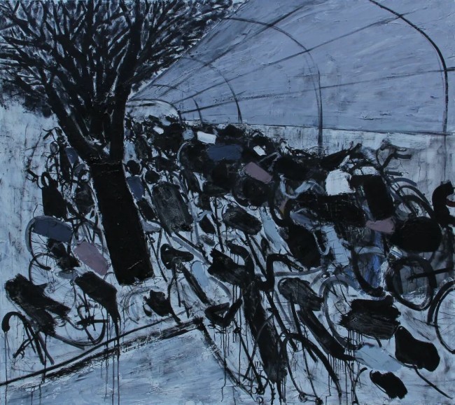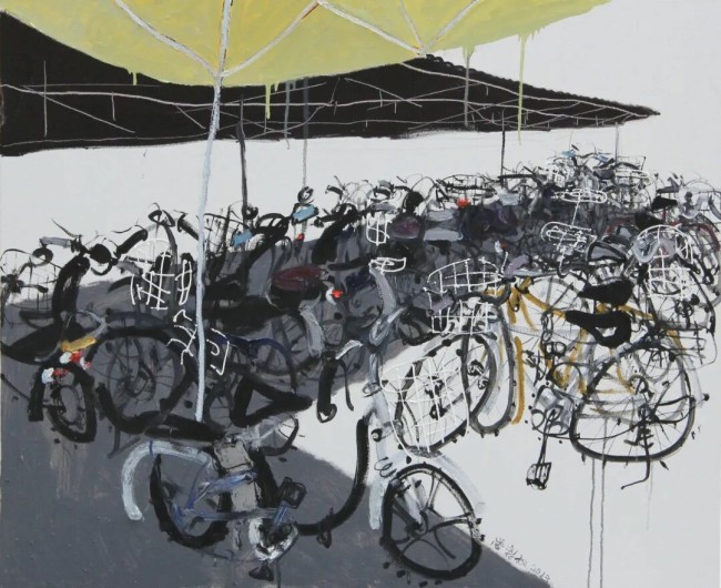 潘新权的创作,始终扎根于他最熟悉的日常。从大学时代起,自行车就与他的生活轨迹紧密相连。教学楼前、宿舍楼下,那些水泥或不锈钢的车棚,那些密密麻麻、新旧不一的自行车,日复一日地映入他的眼帘,最终沉淀为他创作的核心意象。对他而言,自行车早已超越了代步工具的属性,它承载着一代人的青春记忆,是连接过去与现在的情感符号。年长者从中看到时代的印记,年轻人则从中找回童年的碎片,而潘新权,正是敏锐地捕捉到了这一物件背后所蕴含的普遍情感,将其升华为艺术表达的载体。