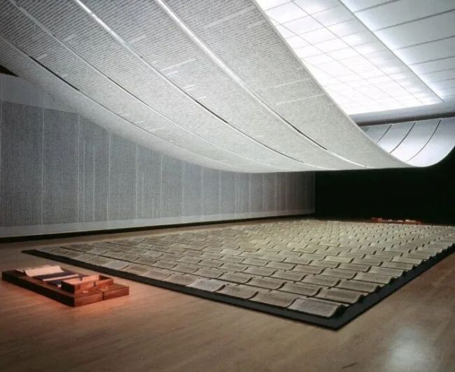 成名作《天书》中,汉字非汉字。初看之下,这些字似乎都散发着熟悉的气息,当观者试图去阅读它们时,却发现它们无法辨认。这种矛盾感使得《天书》在很大程度上剥夺了阅读的乐趣,但赋予了观者一种前所未有的视觉冲击。