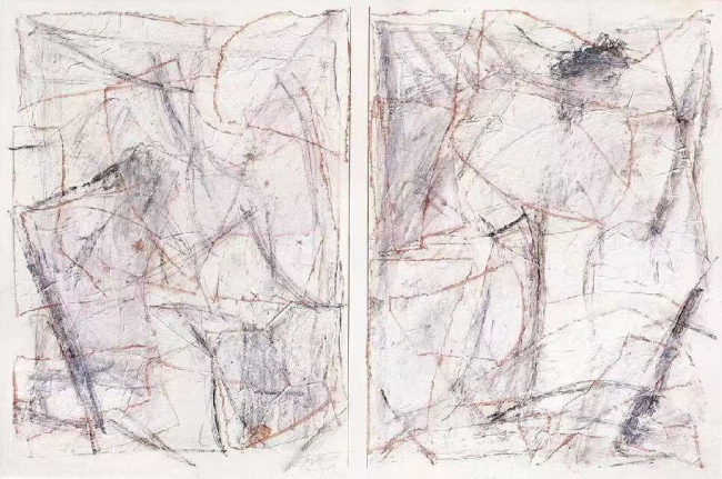 具体而言,他在构图、材质、形象和笔触中利用触觉和借喻,把自己在每一个“当下”的心灵状态,放到长阔高深都无力测透的浩瀚时空中来审视。“我”和历史、传统的复杂关系,直观微妙地显现着——有关联也有差异,折射着不同文化之间的融合和冲突,以及他自身的文化体质。这一幅幅散发视觉魅力的作品,也是一张张显现心灵状态的样本。点线面、色彩、空间、材质等,期待和敏锐开放的感受力相遇,应目会心,同频共振——那时,一个个“我”汇聚成“我们”,在命运的凝视下休戚与共。