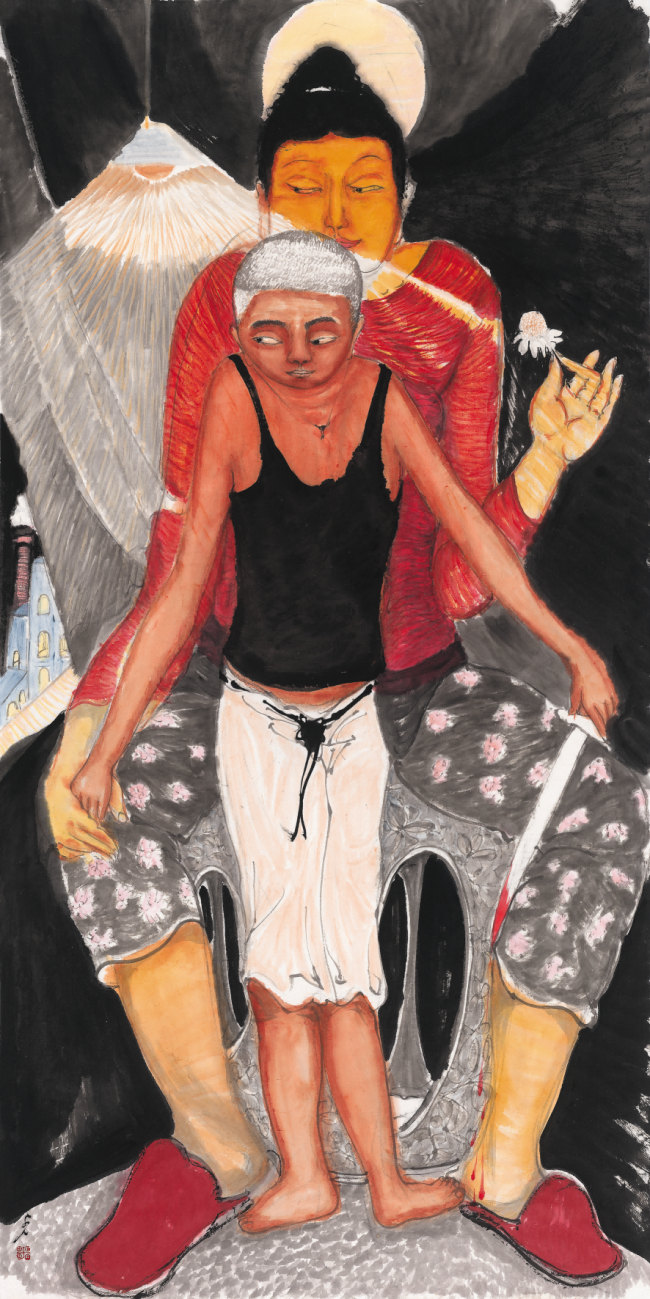就像刚才说的,我一开始就没怎么受“方法为先”的影响,更多是靠身心去感受,包括情绪表达。90年代我的作品会被形容有都市青年的“文心”与“童心”,大概是因为那时候个体对城市的感知没现在这么让人困顿,也不像后来批评话语常把都市生活描述成焦虑的场域。我们成长的乡土环境恰恰是可以自足的,又遇上能够让你放飞的教学氛围,所以能自在寻找自己喜欢的东西。当时对传统的学习,没有现在这么高调的临摹氛围。虽说二年级时,山水指导老师贾又福先生会用系统方法教我们接近传统,但作为人物画室的学生,单靠临摹课接触传统是不够的。所以课余时间,我会主动找中国画里有田园诗意的画面,和自己曾生活过的乡土空间进行连接。这大概就是我从传统里获取的“文心”,和成长中保留的“童心”之间的关联。