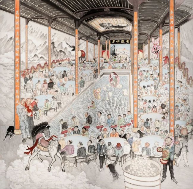 至于人类学、社会学的田野方法,对我而言更像是一种个人行为方式。我们除了从知识系统获取认知世界的间接经验,到了现场面对繁杂对象时,要把它变成画面,既靠绘画本体语言的训练,也靠现场的感知力。这两者没有先后之分,只是不同维度,始终处于反复交织的状态,无需刻意调和。就像伟大的工匠,技术训练到一定程度,自然能把粗糙石头打磨成精致物件;绘画也是如此,把这些不同领域的东西互相渗透、揉搓,才有可能建构起自己的知识系统。另外,我个人很喜欢庄子那种“逍遥游”状态,抑或称之为“游离”的哲学,这本就是中国画里很本源的东西。