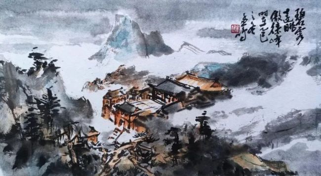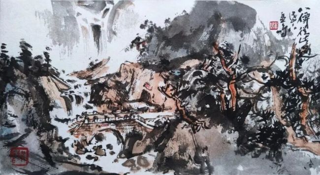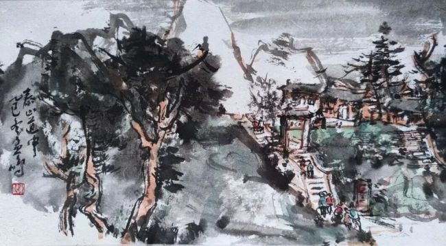 “泰山系列”“黄山系列”“三峡系列”中,古典笔墨的韵味、现代审美的气息与写生的真切感悟交织,营造出开阔苍茫、豁达洒脱的境界,《云山深处几人家》便是代表,山川朴茂、云气苍茫,小桥民居点缀其间,尽显画家驾驭自然物象的宽广胸襟。