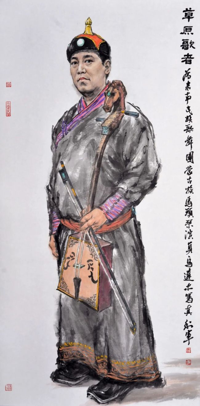 王利军从不满足于对民族服饰的精雕细琢,亦不停留于对异域风情的表面描摹。他笔下的人物,早已超越了人类学的标本意义,而成为一个个有温度、有呼吸、有故事的生命实体。这得益于他独特的造型理念。他拥有扎实的写实功底,却不囿于自然主义的客观再现;他注重笔墨的书写意趣,又不使其流于空洞的形式游戏。在他的画中,写实与写意达成了一种微妙的平衡。人物的形体结构准确而有力,那是他多年锤炼的造型功力使然;而表现这些形体的线条与墨块,却又是如此的自由、灵动,充满了书法的韵律与节奏。他仿佛在用笔墨“写”出人物的生命,而不是“画”出人物的外形。那衣褶的皱痕,既是物质的,又是精神的,它们是高原的风吹过的痕迹,也是岁月的河流淌过的波澜;那面部的光影,既是物理的,又是心理的,它们是阳光的赐予,也是内心光芒的投射。