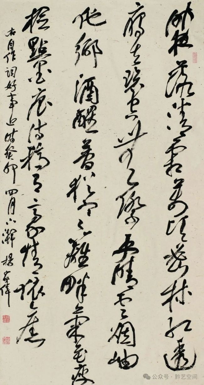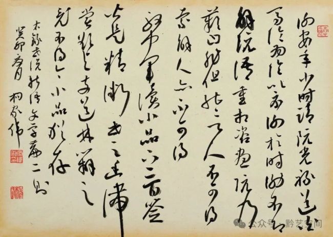 夫笔墨之致,于功夫之外,而在于气格。以实求虚,以真求神,以有求无,终臻韵外之致,象外之境。尺牍秀逸,风神典雅;长轴超迈,气势恢宏。至如初学分布,但求平正;既知平正,务追险绝。年来醉心明清大草,随倪汝玉、王觉斯之腕,笔走龙蛇,布局黑白,顿觉云烟起处,气象万千。