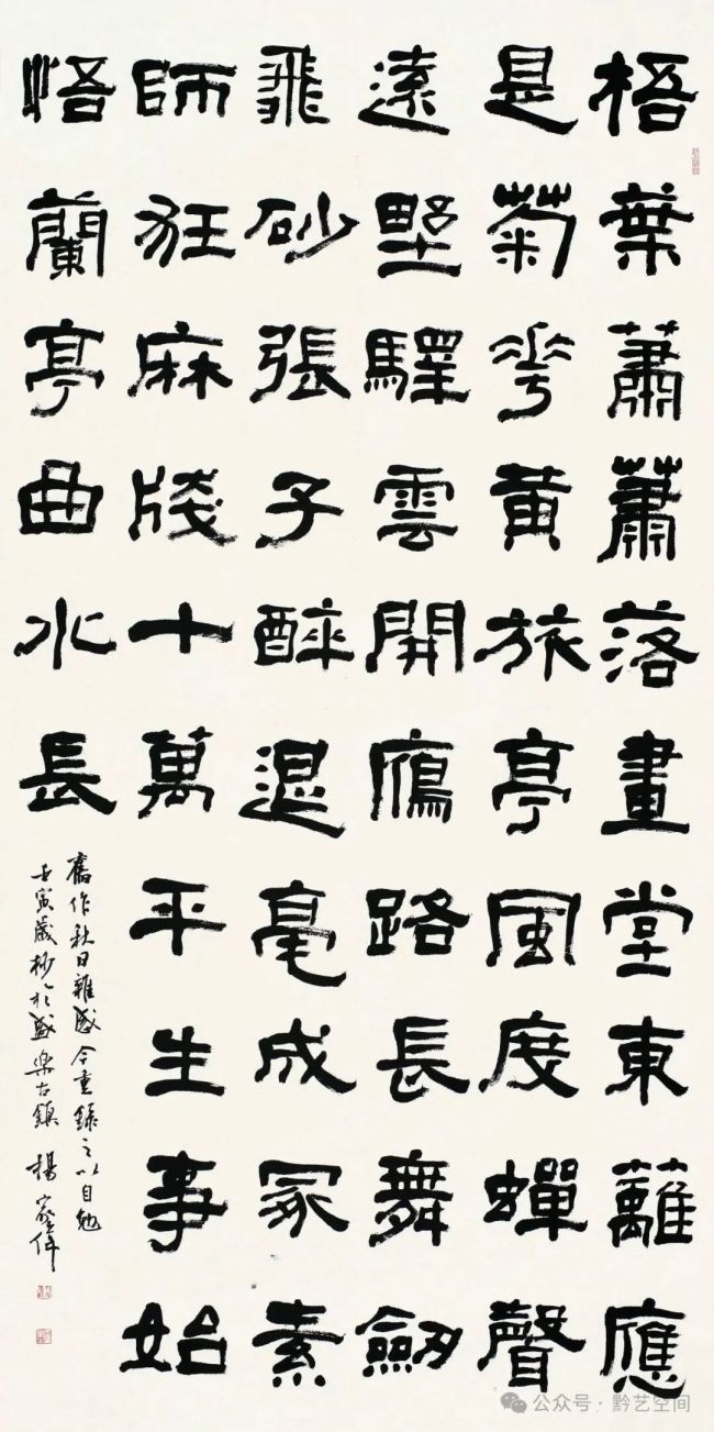 家伟在创作上诸体兼善,将理性思考与感性实践纵横融通。隶书取法高古,笔调沉实蕴藉,善于守拙而风规自远;行书以宋人立基,笔精墨妙,随势运奇,尽显驰骋纵横之志。作家残雪说:“最好的文学一定要有哲学的境界,最好的哲学要有文学的底蕴。”书画创作亦应该如此。家伟诗书俱佳,其诗调清词雅,文约理赡。所谓“技进乎道”,家伟书法中浓郁的书卷之气正是他长期以来的文学修养和哲理辨思的结晶。