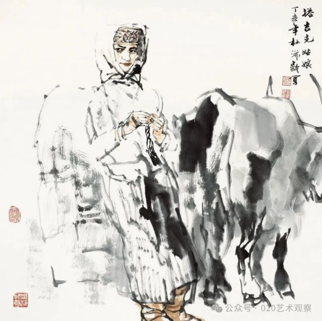 父亲爱才,亦爱人。记得在2015年,我与父亲一道去郎木寺一带采风。父亲注意到一位帮家人忙活的藏族小女孩,当即拿毛笔给她画起速写。这幅速写极为生动精彩,后来多次出现在父亲的画册和展览中。几年后,因为一次活动,父亲和我恰巧又去郎木寺。虽然已记不清路,但父亲坚持要再去探望女孩一家。当女孩认出父亲,激动地抱住父亲时,那感人的一幕令人唏嘘。临别,父亲还坚持塞给这位名叫旦知拉毛的女孩一些生活费。在父亲的世界里,没有高低贵贱和远近亲疏,他心底那份深沉真挚的情感,早已化作日常言行融入他的笔墨里。