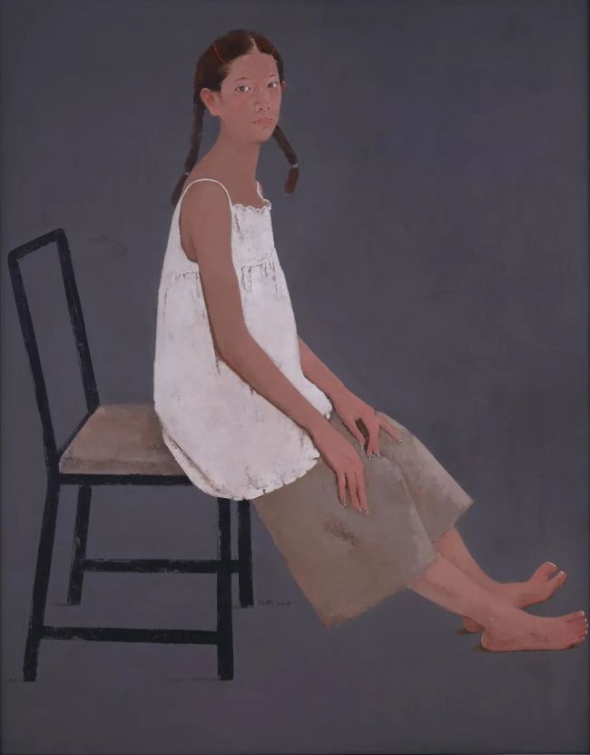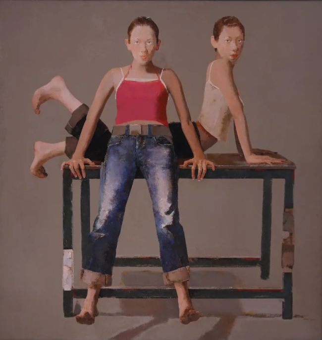 孙洪敏笔下的青春期女孩,没有迷人的甜美优雅,矜持纯情,她甚至也从未曾着意刻画青春期女孩的含真未凿。更没有像画坛流行的一些以年轻女性人物为描绘对象的写实作品那样去刻意表现理想的女性美、人性美、生命美。她的人物塑造表面细密结实,内里粗犷有力,一些硬边线的处理大胆概括而形式感强,她的这种很有现代意味的画法,比一些男性画家更男性。色彩的使用显然并不唯美,有教养的、沉着稳重的灰色调子,令情感含蓄内敛;红、白、黑等色块的精心搭配是为了加强艺术的强度和力量,无不显示出画家胸有城府的艺术洞察力。西方的古典写实油画从文艺复兴以来对女性形象的描绘,以复兴希腊、罗马为旗帜,致力于表现理想的女性美和理念,然而其中绝大多数几乎都带有取悦男性欣赏者的倾向。即使是当下的中国写实油画画坛,这种倾向也并不少见。然而孙洪敏丝毫也没有这种取悦于人的心理,“妆罢低头问夫媚,画眉深浅入时无”不是她的作风,她只是借她的青春期女孩自说自话。虽说孙洪敏并不属于那种自觉女性意识很强的女艺术家,但她的青春期女孩作品却明显流露出一种时下写实油画画坛鲜见的女性主义立场。这或许正是她的青春期女孩作品备受关注的重要原因。