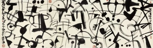 在中国,人们常常创作合体汉字以表达趋吉避凶的意愿,如将“天地人和、日进斗金、魁星踢斗”等美好愿望的文字组合成图案符号,遍及生活各个方面,成为中国吉祥文化的一种形式。在“天书”风格的创作中,韩美林把“模件思维”作为一种现代艺术资源,通过“灵活搭配组合”来追求中国古文字基因中的“构成美”,让中国式“合文”审美在当代文化语境下进行发展。我们可以发现,这种合文特征不仅现代,而且可以满足现代艺术创作对于民族纹样的多种构成需求。所以,模件思维让韩美林以点线块面的方式排列组合古文字的基础单元,一方面,在单调与混乱之间找到审美愉悦感;另一方面,在大脑中不断对比、重构、幻化……落于笔下成于形中,形成一种可以呈现出复杂动态的有序结构,涌现出无限多样的新图形。