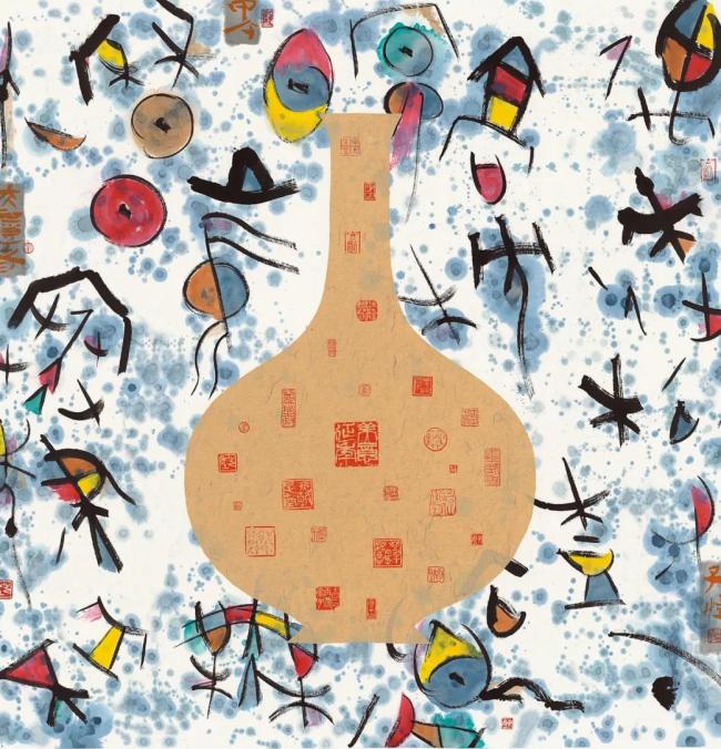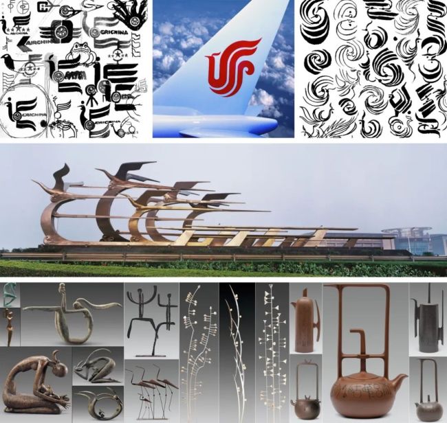 在中国国际航空公司航徽的设计中,韩美林熟练地运用“天书”风格,对凤凰的形态进行总结与创新,将中国古文字“凤”和它所指对象“凤凰”在结构上进行关联,设计出充满生命力的、形式高度简化的火凤凰造型,使标志设计可以天然地跨越文字沟通和图形表意之间的界限,明确地做到“传情达意”。