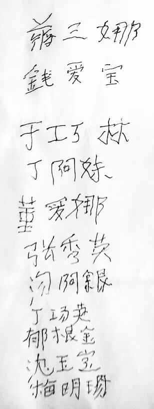 我们请她们写下十姐妹的名字:蒋三娜、钱爱宝、于巧林、丁阿妹、董爱娜、张秀英、汤阿银、丁扬英、郁根金、沈玉宝、梅明珍。