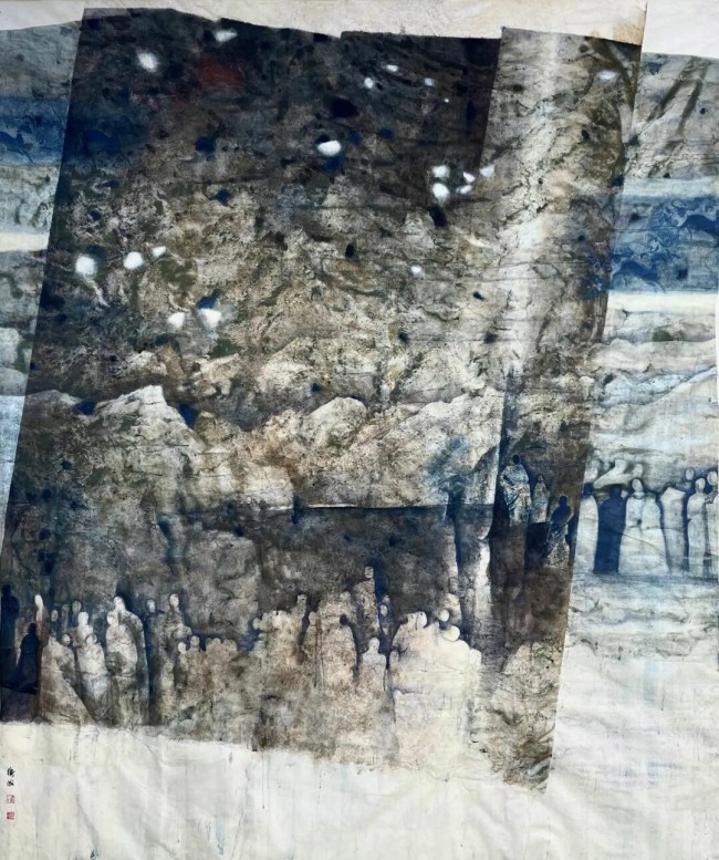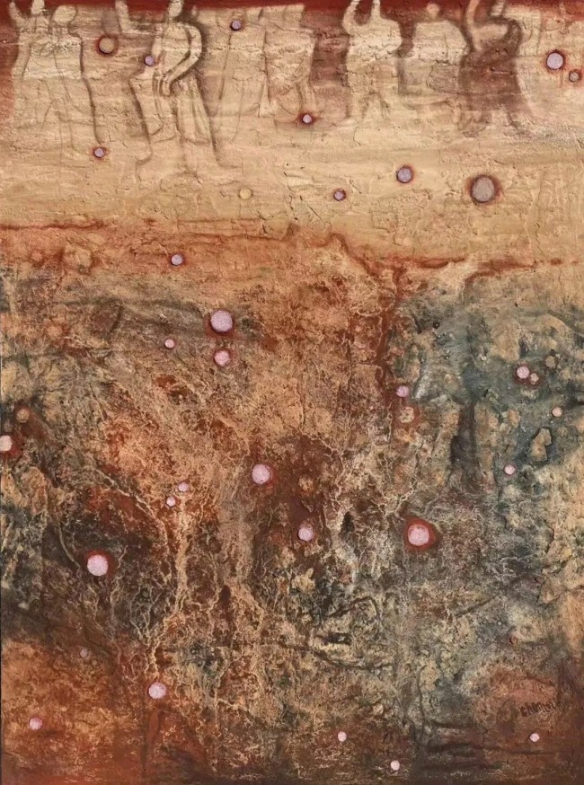 他的画面,始终流动着一种从土地深处生长出来的力量。这种力量并非喧嚣的呐喊,而是沉潜的、绵长的,如同黄土高原上被风切割的沟壑,静默却带着不可撼动的秩序。那些被反复叠加、刮擦、晕染的痕迹,消解了具象的轮廓,却让意象在模糊与清晰的边界中愈发鲜活。他笔下的世界,没有明确的叙事,却处处是故事的余温——是岩画上被风雨磨平的线条,是古城墙在岁月里剥落的砖痕,是人群走过留下的模糊剪影,它们被拆解、重组,融在同一片土地的底色里,成为跨越时空的对话。