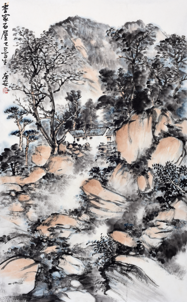 林存安笔下的丘壑,题材丰富多样,既有黄山的雄奇险峻,也有沂蒙山的苍茫厚重;既有桃源的悠远静谧,也有山居的闲适恬淡,每一幅作品的丘壑布局,都蕴含着他对山水精神的深刻理解与对生命的无限热爱。《黄山晨曦图》以长卷式构图铺展群峰竞秀之姿,构图疏密有致,主次分明,远处的山峰高耸入云,以淡墨晕染,显得悠远而朦胧;近处的山石嶙峋突兀,以干笔皴擦,显得厚重而坚实,云海翻涌间,晨曦的暖光为山石镀上一层温柔的色泽,既写出了黄山“奇、险、幻”的自然特质,更暗含“天地初开,生机盎然”的哲思,仿佛让人置身于黄山之巅,感受着晨曦破晓时的宁静与希望。《李家石屋》《山居》《春雨初足水满田》等作品,则聚焦皖南山村的寻常景致,脱离了传统山水画的雄奇宏大,转而追求平淡天真的田园意境。画作中,白墙黛瓦的民居隐于林木山石之间,一条蜿蜒的小径穿梭其中,溪边的垂柳随风摇曳,山间的清泉潺潺流淌,神情闲适,悠然自得。这种丘壑布局,没有复杂的构图,没有华丽的笔墨,却将“结庐在人境,而无车马喧”的隐逸意趣表现得淋漓尽致,这既是他对山水生活的真情表达,也是他“澄怀味象”艺术追求的生动体现。《桃花源山居》中,他以开阔的构图,描绘了一幅“绿树村边合,青山郭外斜”的桃源盛景,远山如黛,近水含烟,民居错落有致,林木郁郁葱葱,整个画面充满了祥和安宁的气息,寄托了他对美好生活的向往与追求,也彰显了中国文人“天人合一”的生命理念。