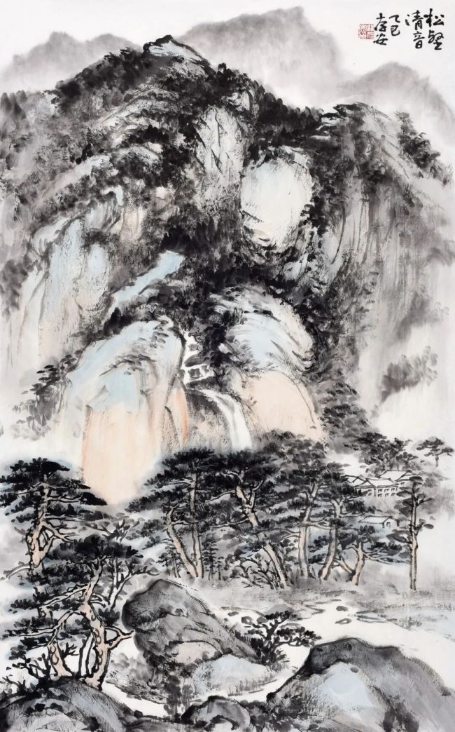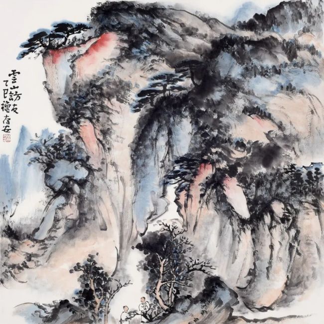 《松壑清音》以松涛为引,借“听松”的传统母题,传递“天人合一”的生命感悟。画作中,苍松挺拔,枝叶舒展,山间云雾缭绕,清泉潺潺流淌,松涛阵阵,清音袅袅,仿佛能听到松树的低语与清泉的吟唱。林存安以细腻的笔墨,将松的苍劲、云的空灵、泉的清澈表现得淋漓尽致,笔动、墨动、色动之间,动中有静,静中生情,尽显山水灵气,也让观者在欣赏画作的同时,能够感受到大自然的宁静与祥和,忘却尘世的烦恼,达到“澄怀观道”的精神境界。《云山访友》则以古人“携琴访友”的雅事入画,苍崖间的白衣行者,踏着山间小径,向着云雾深处走去,仿佛要去寻访志同道合的友人。画面的构图简洁而富有诗意,云雾的晕染空灵缥缈,山石的皴擦苍劲有力,白衣行者的线条简洁流畅,让古老的文人意趣在当代有了鲜活的模样,也传递出林存安对真挚情谊的向往与追求。