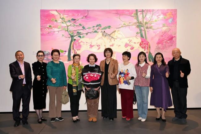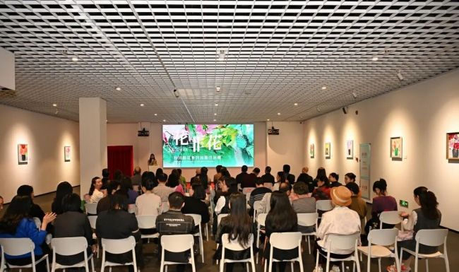 五十幅花卉作品错落挂着,最大的一幅叫《春日迟迟》,宽近四米,高两米多,占据了整面墙。那些花就挂在墙面上,开得自在而沉静,不急着向人诉说什么。