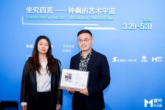 北京中关村永丰产业基地发展股份有限公司董事长侯敏艳女士代表主办方,向艺术家钟飙颁发作品收藏证书。