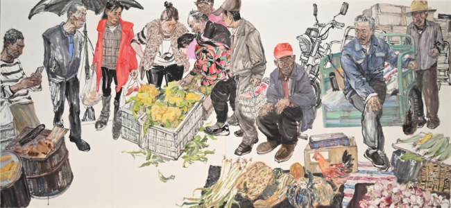 党震:先说说灵感。我老家在山东济南,岳父母家在泰安,走亲戚时经常遇到农村赶集。有时也特意去赶集,买点新鲜蔬菜。集市上人很多,形形色色的,在都市里看惯了城里人,偶尔见到穿着朴素、脸上晒得黑黑的形象,就觉得很有意思。这种创作冲动很简单,就像去民族地区采风一样,觉得形象有意思、环境有意思,并没有太复杂的哲学道理。集市上人来人往、吆喝叫卖,老头晒着太阳……这种生活片段,我觉得值得画一画,并不是每张创作都需要复杂深刻的观念支撑。