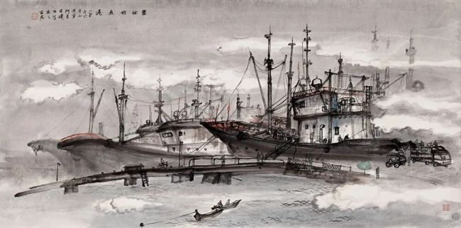 与《游寒山寺》的清雅不同,《繁忙的渔港》将视角聚焦于渔家生活,尽显烟火气与笔墨张力。画家以浓墨勾勒船体、礁石,线条劲健有力,精准捕捉船只错落排布的形态与渔民劳作的动态;淡墨晕染水波与云雾,与浓墨形成强烈对比,既突出了渔港的繁忙景象,又不失水墨写意的空灵。作品以写实的造型承载写意的精神,将渔家生活的质朴与水墨艺术的韵味相结合,让传统笔墨焕发出现实生活的生命力。