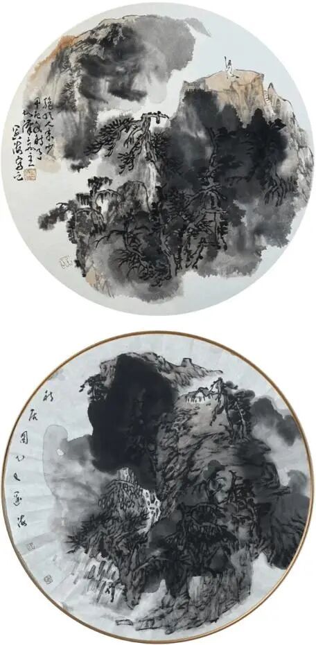此外,王阔海还独创了“汉风皴”法,以笔代刀,将汉画石刻的质感融入水墨皴擦。他画狮皮毛时运用此法,用笔果断如刻刀凿石,方向多变,力度丰富,使皮毛的粗糙、厚实和立体感跃然纸上。再辅以积墨、破墨、泼墨等技法,先淡墨铺底,再浓墨皴擦,层层叠加,墨色浓淡干湿焦五色兼备,使狮皮毛色有深有浅、有明有暗,凹凸有致,虚实相生。