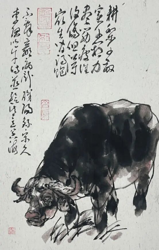 他所提出的“中国画写意六性论”——纸性、水性、笔性、墨性、色性、心性,不仅是对其个人创作经验的总结,更是对文人画道统的当代激活。在他看来,纸要尽其性,水要尽其韵,笔要尽其妙,墨要尽其玄,色要尽其雅,而这一切最终归于心性,由心统领,天人合一。画牛,对他而言,不是机械的描摹,而是一场“心性与物象”的对话。正因如此,他笔下的牛才有了那种既在红尘中耕耘,又在天地间逍遥的超脱感。