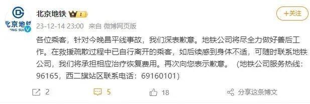 北京地铁官方微博12月14日深夜发布:各位乘客,针对今晚昌平线事故,我们深表歉意。地铁公司将尽全力做好善后工作。在救援疏散过程中已自行离开的乘客,如后续感到身体不适,可随时联系地铁公司,我们将承担相应治疗恢复费用。再次向您表示歉意。(地铁公司服务热线:96165,西二旗站区联系电话:69160101)