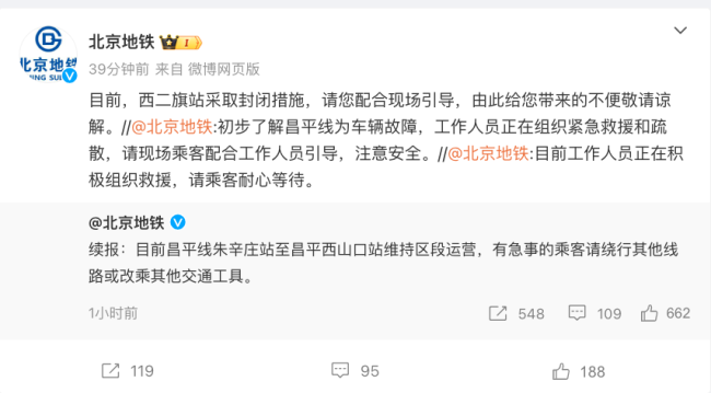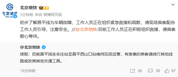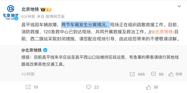 北京地铁官方微博发文称昌平线因车辆故障,两节车厢发生分离情况,现场正在组织疏散救援工作。目前,消防救援、120急救中心已到达现场,共同开展救援及救治工作。