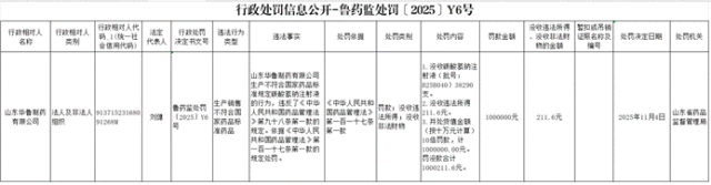 据山东省药品监督管理局官网12月8日发布的行政处罚信息公开——鲁药监处罚【2025】Y6号:山东华鲁制药有限公司生产不符合国家药品标准规定碳酸氢钠注射液的行为,违反了《中华人民共和国药品管理法》第九十八条第一款的规定。依据《中华人民共和国药品管理法》第一百一十七条第一款的规定处罚:1、没收碳酸氢钠注射液(批号:B25B040)38290支;2、没收违法所得211.6元;3、并处货值金额(按十万元计算)10倍罚款,计1000000.00元。罚没款合计1000211.6元。