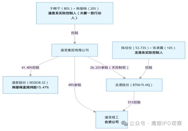 道恩精工作为其控股子公司,是违规事项的直接执行主体;道恩集团则是龙港股份第二大股东,也是上市公司道恩股份(002838)的控股股东,同时也是道恩精工的关联方,此次1.268亿元交易正是基于“股东——子公司”的关联身份触发监管认定。
