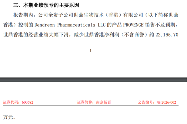 南京新百在公告中明确,全资子公司世鼎生物技术(香港)有限公司(以下简称“世鼎香港”)控制的Dendreon Pharmaceuticals LLC(以下简称“丹瑞”)产品PROVENGE销售不及预期,导致世鼎香港经营业绩大幅下滑,减少世鼎香港净利润(不含商誉)约2.22亿元。