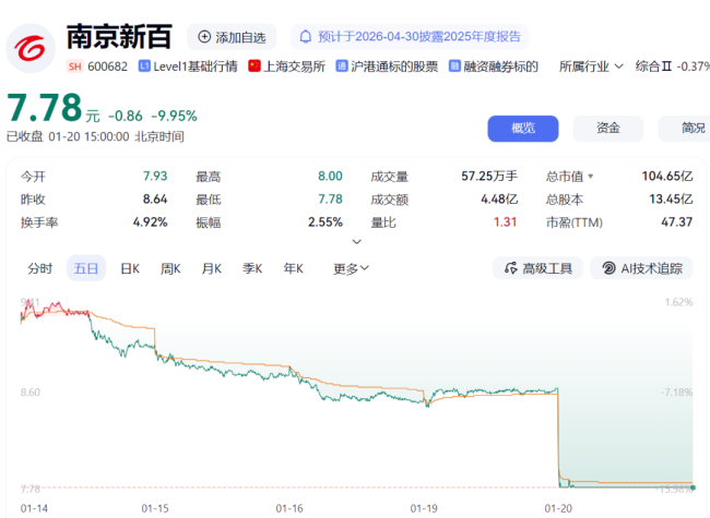 次日(1月20日)开盘,南京新百股价高开低走,最终以7.78元/股收盘,跌幅达9.95%,总市值缩水至104.65亿元。