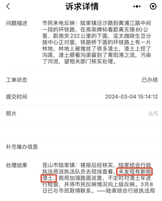对于固废渣土的偷倒情况,记者拨打了当地12345政务服务热线反映。3月8日,陆家镇综合行政执法局回应表示,经现场查看,未发现有新倒渣土,该局会加强路面巡查,不定时对渣土车进行巡查。