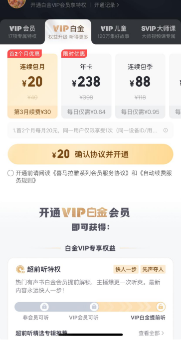 喜马拉雅有VIP会员、VIP白金、VIP儿童、SVIP大师课四种类型。在VIP白金会员中,连续包月/季/年选项下方无“自动续费”醒目标识,需点击灰色小字的“购买须知”才弹出窗口,显示“第三个月起恢复30元/月自动续费”等条款,信息隐藏较深。