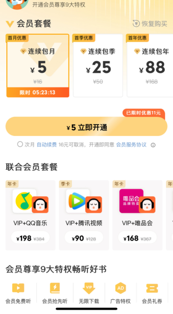 懒人听书会员有连续包月/季/年、12个月、3个月、1个月共六种选择,其中连续包月(含包季/年)付款下方有一行小字,且“自动续费”四字做了变色处理,相对醒目。