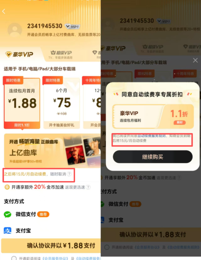 记者测评发现,自动续费“藏”得较深的APP包括网易云音乐和喜马拉雅等。网易云音乐黑胶VIP开通页面显示“1元开通会员”,上方有“连续包月”字样,下方用红字提示“每月15元自动续费”。点击“1元立即开通”后,系统弹窗提示阅读《自动续费协议》《会员服务协议》。继续操作后,页面显示付款价格、服务名称等,其中服务内容注明“会员到期前一天通过支付宝自动续费,关闭则不再续费”。