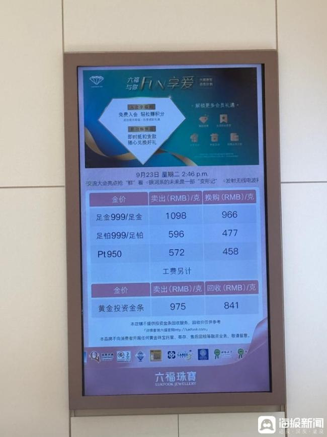 9月23日,六福珠宝店内显示,今日金饰单价上涨至1098元/克,有店员表示9月金价涨势颇猛。