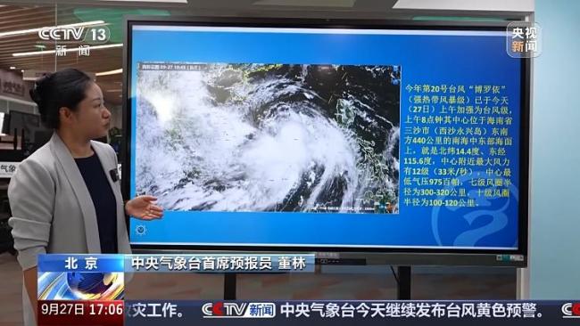 中央气象台首席预报员 董林:目前在西北太平洋和南海一共有两个台风正活跃着,需要我们特别关注的是今年第20号台风“博罗依”,在27日的上午加强了台风级。从最新的云图上可以看到,它整体的云系覆盖面积非常大,核心区的云也比较密,说明它的强度比较强。