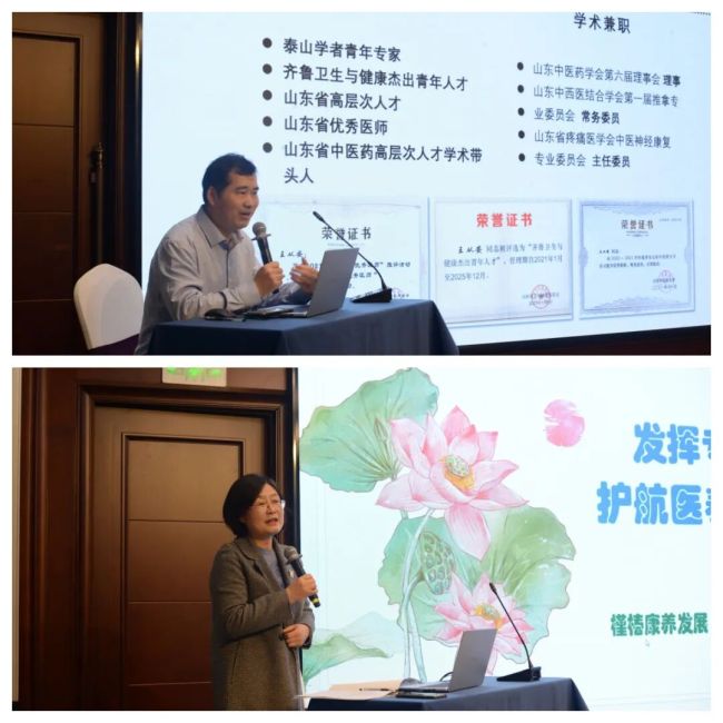 在随后举行的专题讲座环节,山东第一医科大学附属颈肩腰腿痛医院康复科主任王从安、济南护理学会秘书长刘业惠分别围绕"社区医院医养结合康复科建设与发展"和"护航医养结合新模式"作了专题报告。