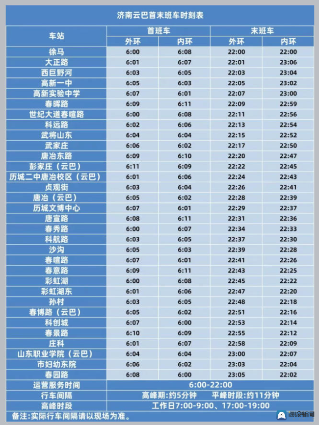 记者从济南轨道交通集团获悉,12月6日济南云巴将开通运营。运营服务时间为6:00-22:00,为方便市民乘车,首班车实行多点发车。