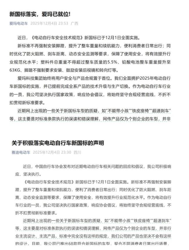 面对新国标,国内电动自行车龙头企业已积极行动。“雅迪”宣布已推出68款符合新国标的车型,“爱玛”也表示“提前完成全系产品技术升级与生产切换”。两个品牌均承诺持续优化设计,提供更安全、实用、舒适的产品。“雅迪”还针对“毛豆”车型设计考虑不周公开致歉,说明该款车型“不能带小孩”“缺乏储物空间”不是新国标的规定,而是对执行要求的理解不准确。