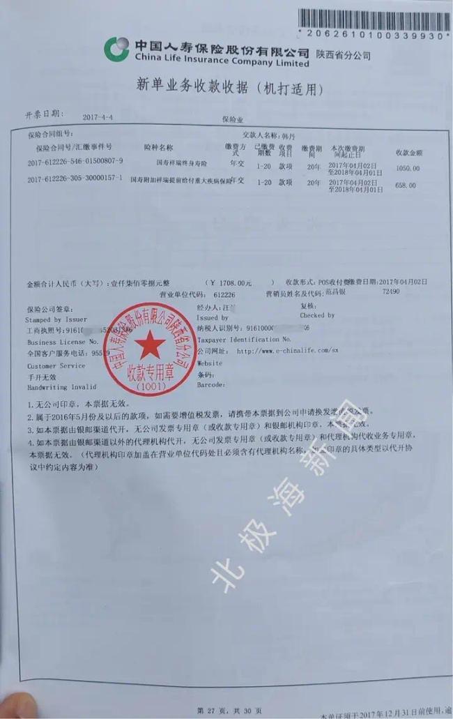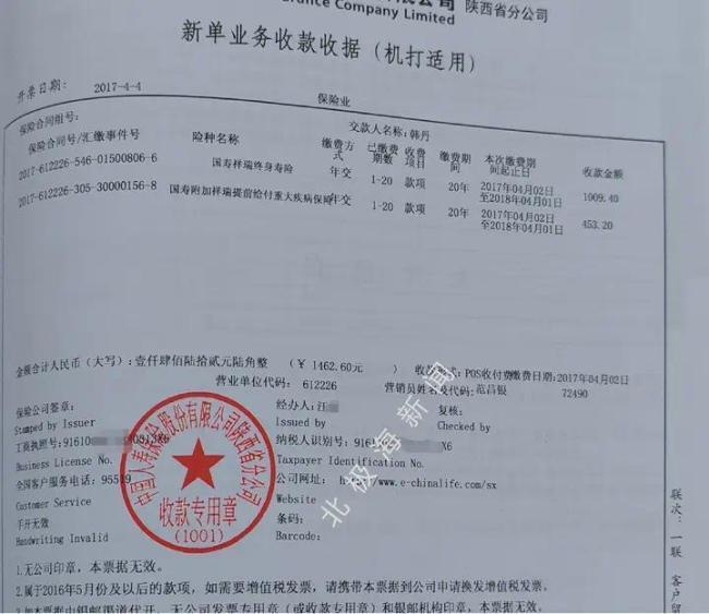 (图为两份保险额合同《新单业务收款收据》)