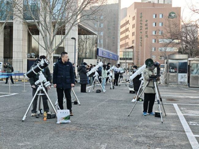3日19时许,在北京天文馆内的西停车场上,10台天文望远镜整齐排列,观众们围在周围,轮流观看月全食过程。