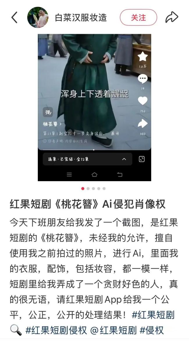 近日,有网络博主“白菜汉服妆造”发文称,自己此前拍摄的一组汉服造型照片遭他人盗用,不仅服饰妆造被照搬,连他本人面部肖像也直接被挪用,用于AI生成短剧《桃花簪》,因此,这名博主在毫不知情的情况下,被“客串”了剧中一名猥琐好色的配角“刘大”。