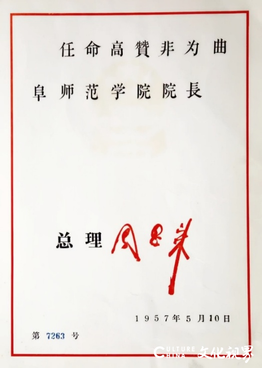 首任院长高赞非先生,就是一位当世名儒。曾师从国学大师熊十力、梁漱溟先生研究儒学,执教于南京中央大学哲学院。抗战时期参加革命,当选为滨海根据地参议长,新中国成立后担任济南市教育局局长。1955年,出任山东师范专科学校校长。为纪念伟大的思想家、教育家孔子,国务院决定将山东师范专科学校从济南迁来曲阜升格为本科高校曲阜师范学院,其任命书是周恩来总理签署。