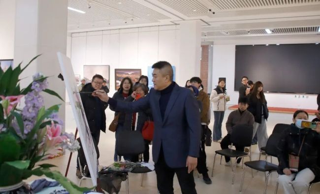 活动现场,艺术家们以展厅内精心布置的时令花卉为创作题材,从构图起笔,明暗铺陈到色彩晕染,每一个创作环节都进行了细致示范。在画布前,老师们手持画笔从容挥洒,时而凝神观察静物形态,时而俯身调整色彩层次,将花卉的鲜活姿态与光影变化精准呈现在画布之上。创作间隙,艺术家们结合自身数十年的写生经验,向围观爱好者们毫无保留地分享构图技法如何通过主次搭配突出画面主体,如何利用留白营造空间感;详解色彩搭配心得和冷暖色调的平衡运用,环境色对物体质感的影响等专业知识。