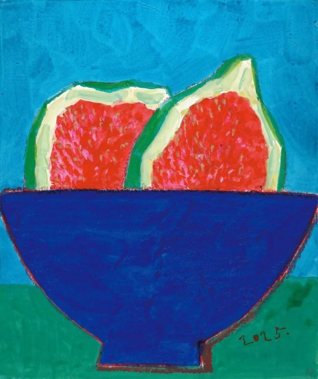 蒋:我从2007年开始“美丽生活”系列的探索,至今已有18年。这一系列始于北京画院的首展,展览名为“制造理想”。按理说,理想不是制造的,但展出的这批作品都是虚拟场景,是我对理想生活的想象,比如男女与瓜果相伴、游山玩水等画面。早期“美丽生活”系列以人物为主,常绘一男一女与桃子、石榴,但我永远不是在表达人物本身:一男一女代表了一个世界,又表达了一种情爱,亲情、爱情、友情;桃子和石榴二者在民间文化中是长寿、多子多福的吉祥符号。这可能与我稳定的生活有关,生活安稳后,我更多回归对生活本身的思考,画更贴近生活的内容。